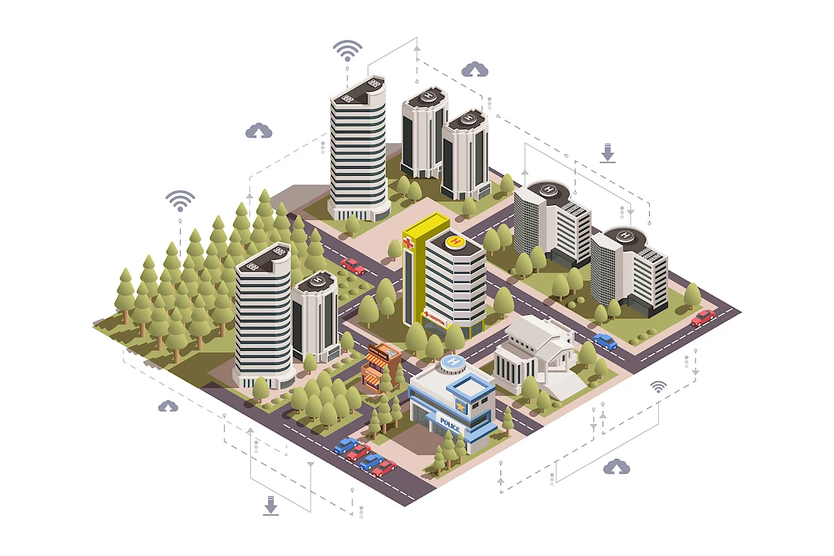 Illustratie van een virtuele stad met dataverbindingen.© Building vector created by macrovector - www.freepik.com