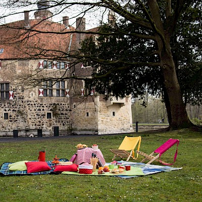 Geniet van je picknick in de prachtige kasteelomgeving van Burg Vischering en de omgeving met je picknickmand van Café Reitstall. Café Reistall ligt direct aan de binnenplaats van het kasteel en hoort bij Café Terjung, de duurzame bakkerij uit Lüdinghausen. Hier worden de lekkernijen voor je picknickmand gemaakt in een familiaire sfeer, met regionale producten, traditionele recepten en gezondheidsbewustzijn. Maar de keuze van de picknickmand is zeker niet eenvoudig... je kunt kiezen tussen de dwergenpicknick, de prinsessenpicknick en de mannenpicknick. Er is dus voor ieder wat wils!