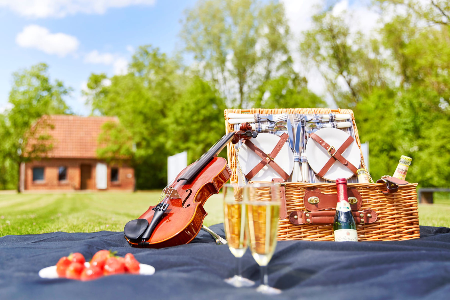 Bij Kulturgut Haus Nottbeck is er een idyllische picknickplaats en een bijpassende picknickmand!