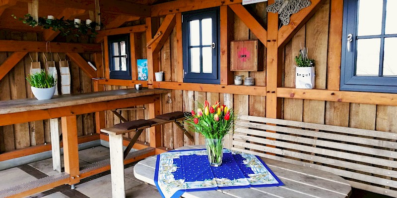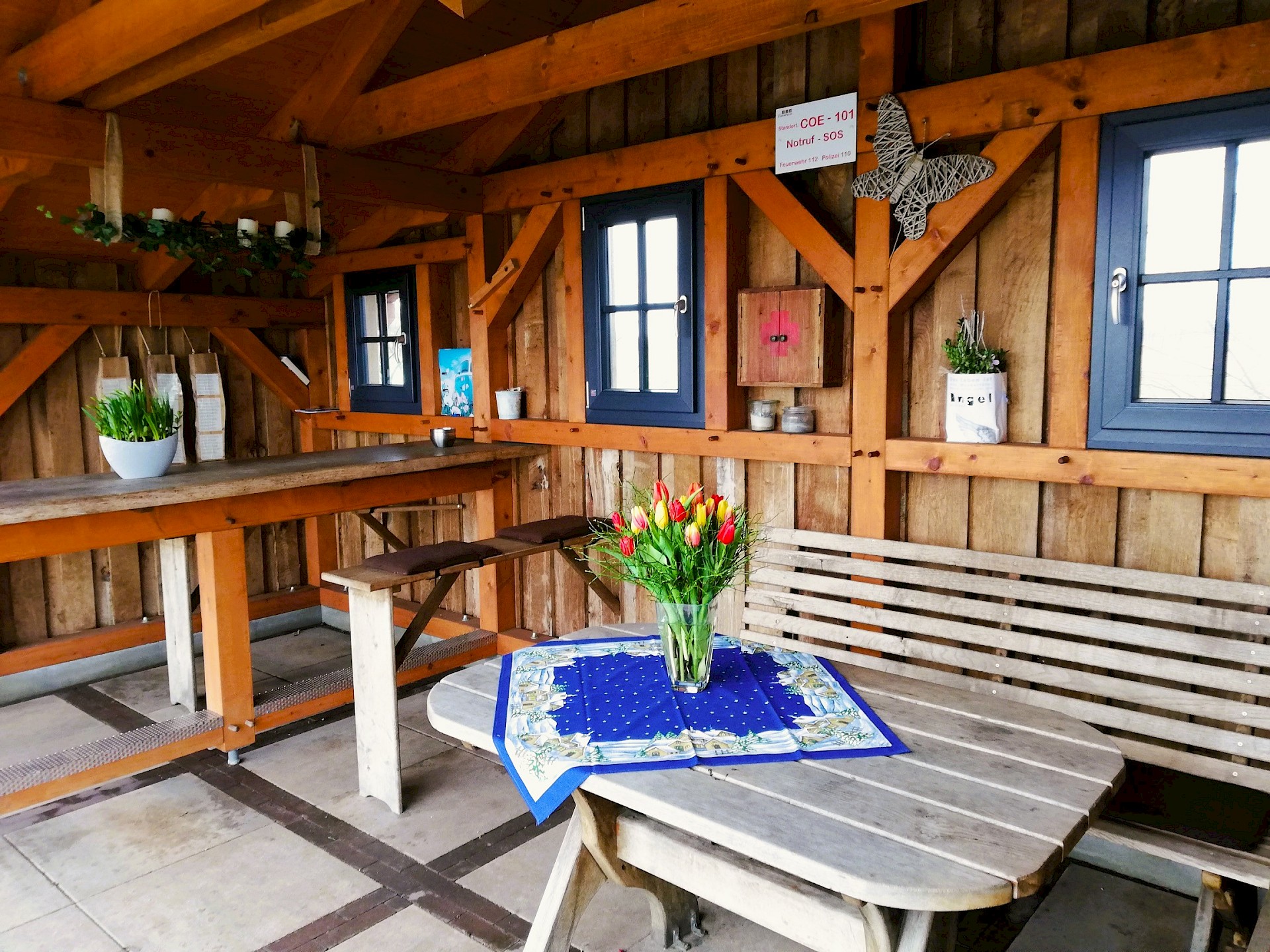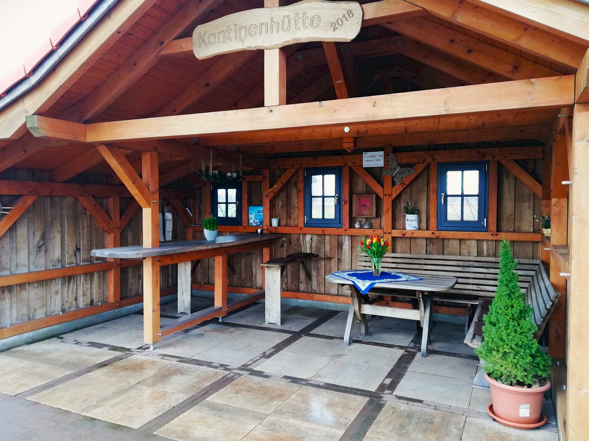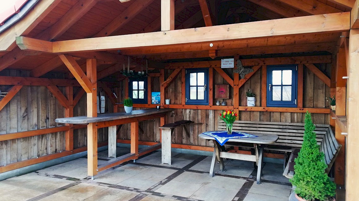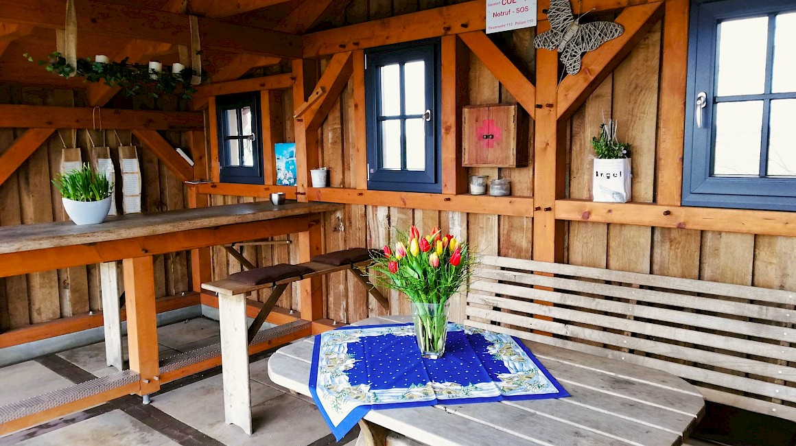De kantinehut is gebouwd door acht naburige families met hun eigen inzet en met geld van de Baumberge regio Leader pot. Er is niet alleen veel liefde gestoken in de buitengevel, maar ook in het interieur van de hut: er zijn niet alleen kussens op de banken en verse bloemen op tafel, maar ook fietsreparatiesetjes in een klein houten kastje.
