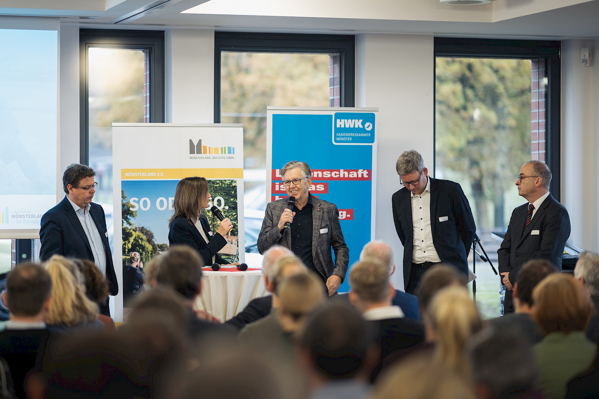 Die Wärmewende ist für das Erreichen der Klimaschutzziele von Nordrhein-Westfalen ein entscheidender Faktor. Bis 2045 will das Land klimaneutral werden. Rund 45 Kommunen des Münsterlandes informierten sich daher heute bei der Veranstaltung „Wärmewende gemeinsam gestalten – denn Münsterland ist Klimaland“ im Handwerkskammer Bildungszentrum in Münster über Möglichkeiten und Herausforderungen. Acht Kooperationspartner hatten dazu eingeladen, die Notwendigkeiten von kommunaler Wärmeplanung und Möglichkeiten einer geothermischen Wärmeversorgung zu diskutieren und ihre Chancen zu nutzen. Die Veranstaltung ist eine gemeinsame Initiative des Münsterland e.V., der Landesgesellschaft NRW.Energy4Climate, der Handwerkskammer Münster, den Münsterland-Kreisen Borken, Coesfeld, Steinfurt und Warendorf sowie der Stadt Münster und wird von der IHK Nord Westfalen unterstützt.
