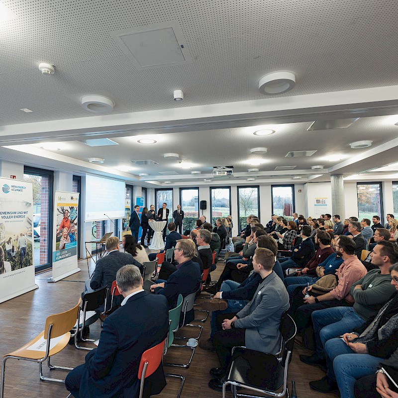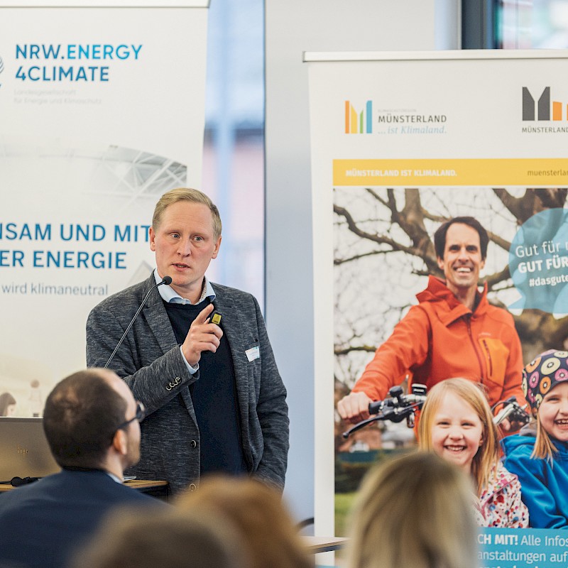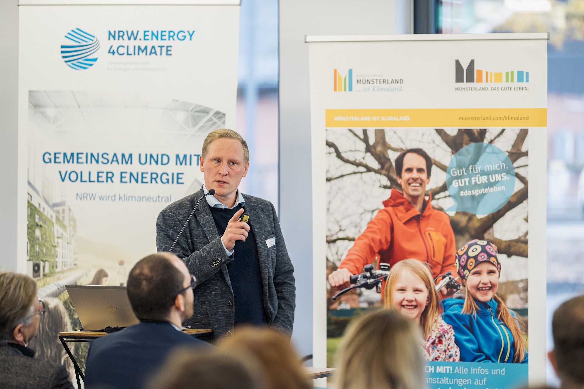 Bei der Veranstaltung stellte sich auch das kürzlich eröffnete Regionalbüro Münsterland der Landesgesellschaft für Energie und Klimaschutz, NRW.Energy4Climate, mit seinem NRW.Klimanetzwerker Christian Böckenholt vor. Es ist eins von derzeit sieben Regionalbüros in NRW, ansässig bei der IHK Nord Westfalen in Münster. Die Regionalbüros sind Anlaufstelle für Kommunen und Unternehmen vor Ort im Bereich Klimaschutz und Energieeffizienz. Ihre Klimanetzwerkerinnen und -netzwerker treiben Klimaschutzprojekte voran und wirken als Vernetzungsstelle zwischen Bezirk, Landesebene und Regionalpartnern.