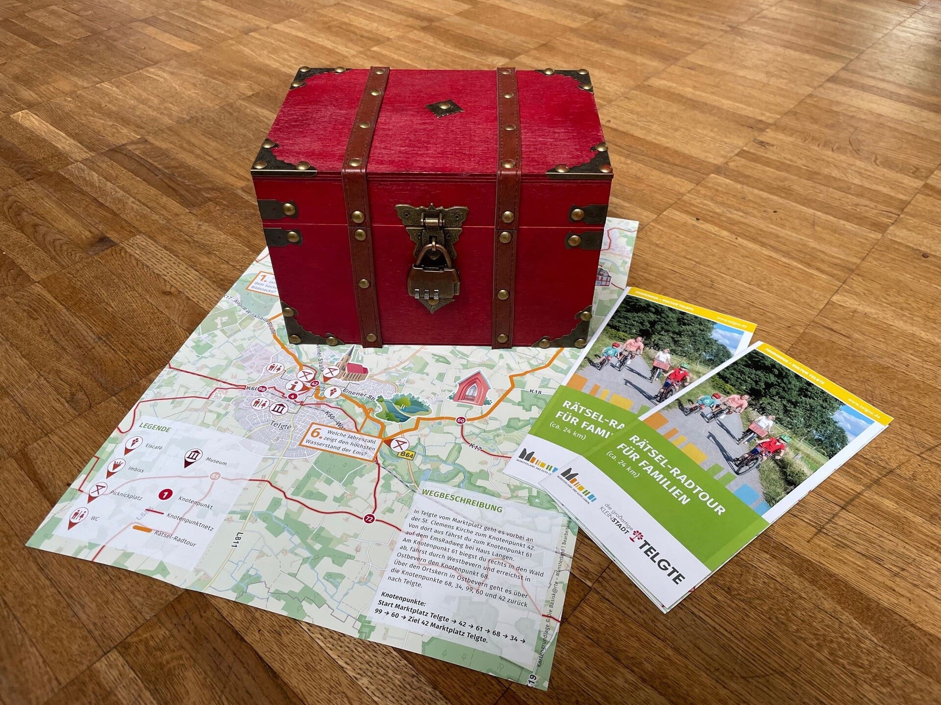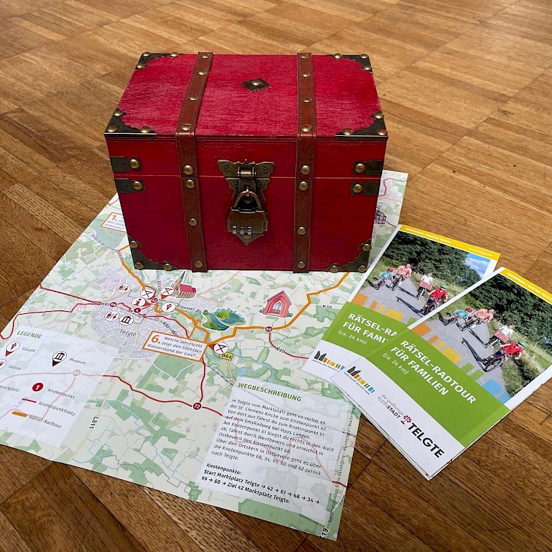 Noch aufregender wird die Radtour, wenn am Ende eine Schatzkiste auf die kleinen Radfahrerinnen und Radfahrer wartet. Aber so einfach ist sie nicht zu öffnen! Zuvor müssen sechs Rätsel gelöst werden. Tourismus + Kultur Telgte hat diese spannende 24 Kilometer lange Rätsel-Radtour mit Startpunkt in Telgte entwickelt, die über flache Wegstrecken durch malerische Landschaften in Westbevern und Ostbevern verläuft.