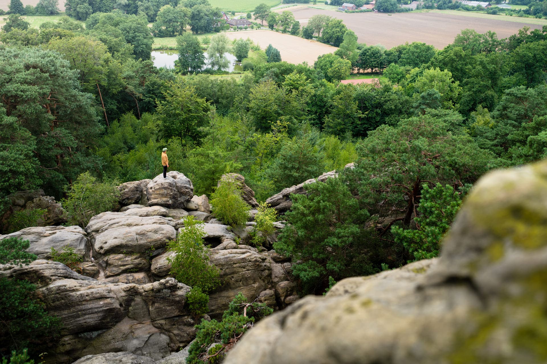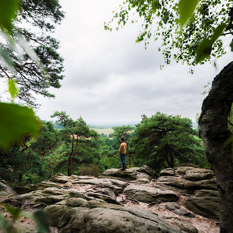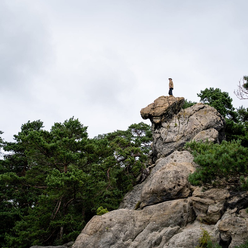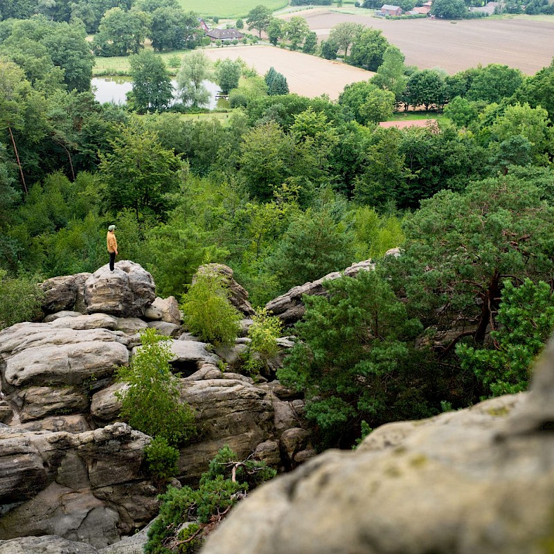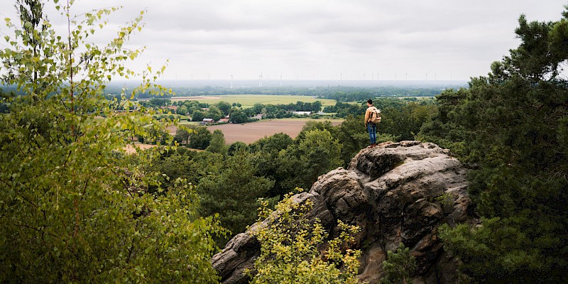 Die Dörenther Klippen, eine der bekanntesten Landmarken im Münsterland, stehen im Mittelpunkt der Wanderung auf dem Premium-Wanderweg bei Ibbenbüren. Die ausgedehnte Wanderung ist auch für ambitionierte Wandernde ein Vergnügen. 405 Meter geht es auf dem 9,3 Kilometer langen Rundweg bergauf.