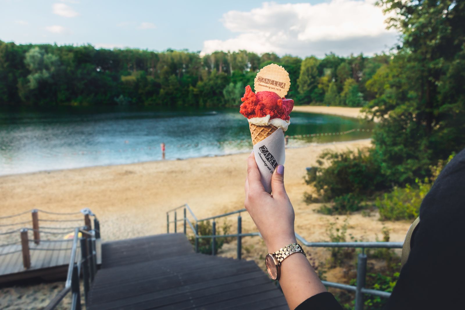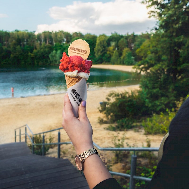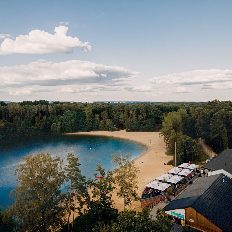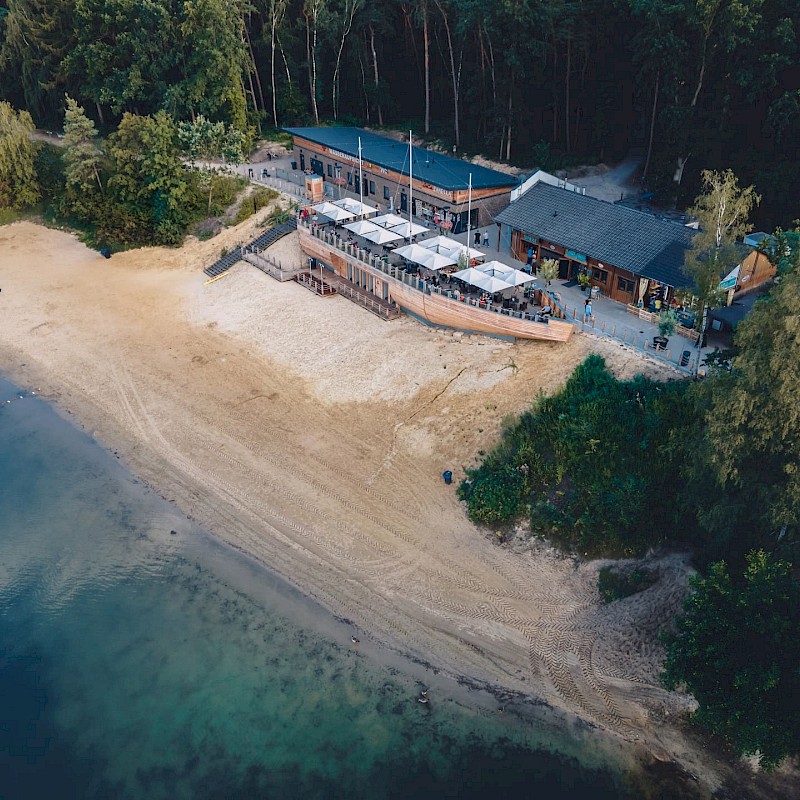 Vor allem in den Sommermonaten erfreut sich das Strandbad des Sees (kostenpflichtig) großer Beliebtheit. Direkt am Strand befindet sich ein Mehrzweckgebäude in Form eines Piratenschiffes, in dem die Schwimmmeisterstation, ein Eiscafé sowie Toiletten untergebracht sind. Unmittelbar daneben wurde ein Restaurant mit vielen kulinarischen Highlights errichtet. Genieße den Ausblick vom Deck des Schiffs über den See und lass dir die vielfältigen Speisen oder ein Glas Wein schmecken!