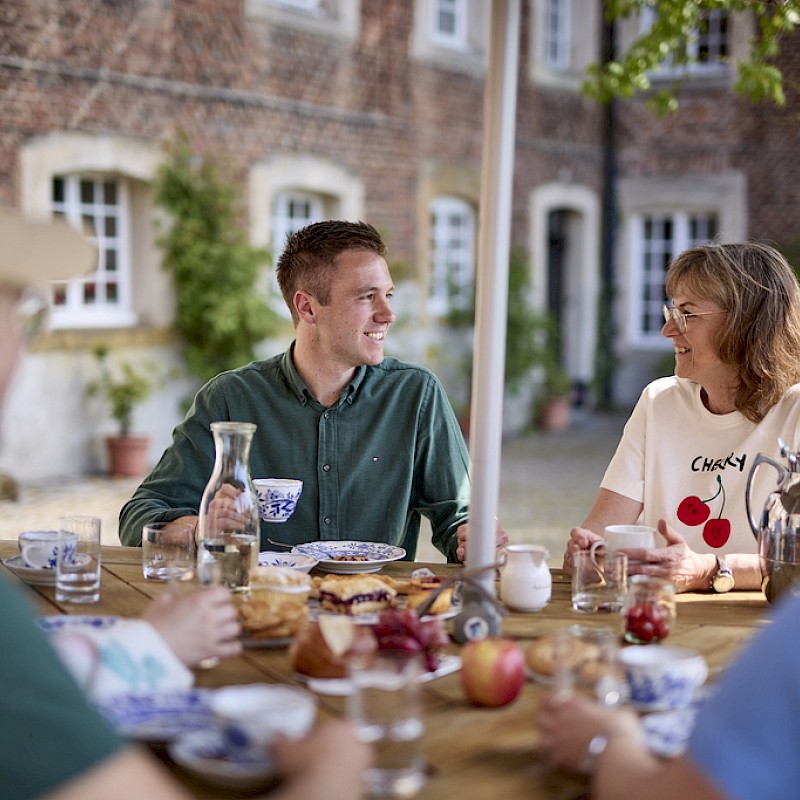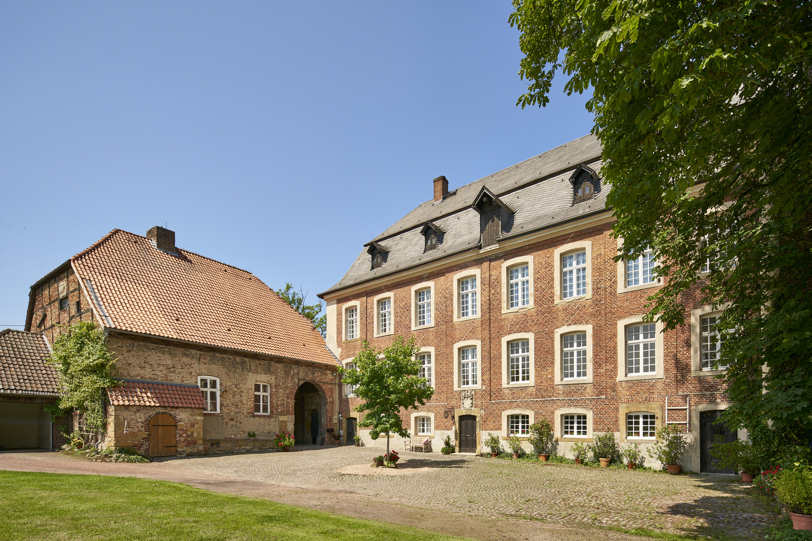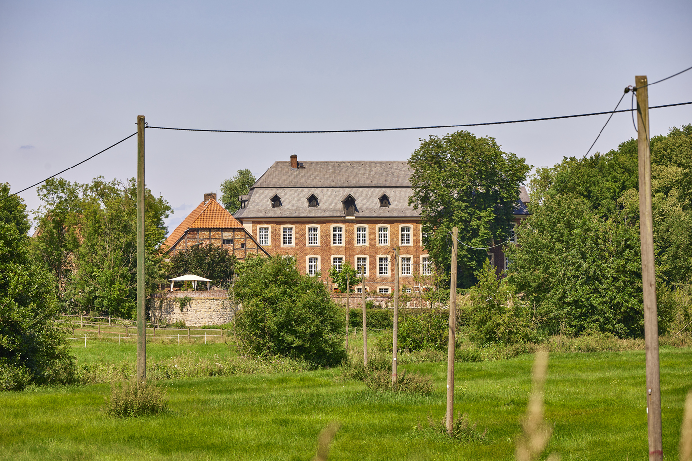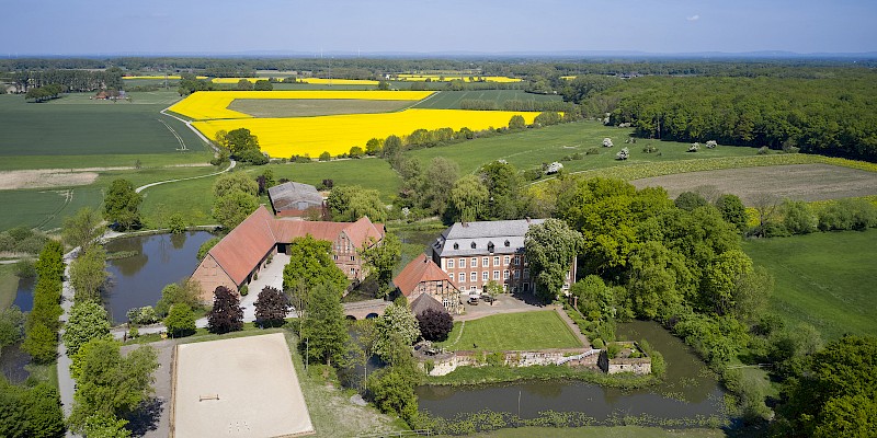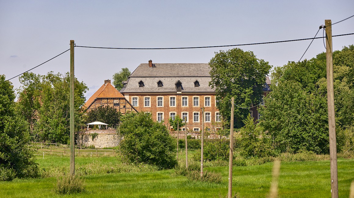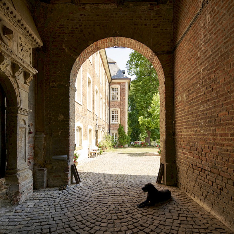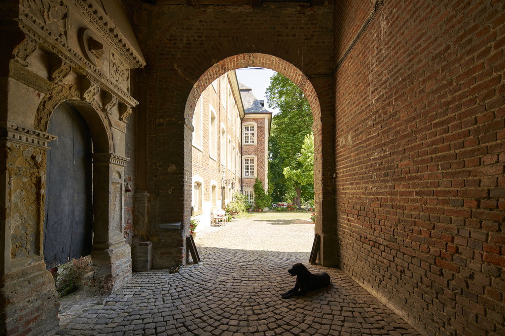 Es beginnt auf dem Weg hierher: Eine schmale, geteerte Straße, eigentlich ein einfacher Wirtschaftsweg, führt durch eine Kastanienallee direkt auf die Hofstelle zu. Alles wird ruhiger, natürlicher. Wenn man dann auf den Hof fährt, öffnet sich eine Anlage aus Rasenflächen, Bäumen und Wiesen, auf denen die Pferde laufen. Dazu kommen die Teichanlagen, die sich um den gesamten Hof und das Wohngebäude schlängeln. Und natürlich die alten Gemäuer, die dem Ort seinen Charakter geben und das Gesamtbild erst richtig rund machen. Haus Geist ist ein aktiver Betrieb und nichts Steriles, das nur für Besucher instandgehalten wird. Hier ist echtes Leben – unsere Pferde, unser Hund, zwei Katzen. Es ist unser Arbeits- und Lebensmittelpunkt. Wir bewahren das Vergangene und führen es lebendig weiter, statt es einfach einzulagern oder herzurichten.
