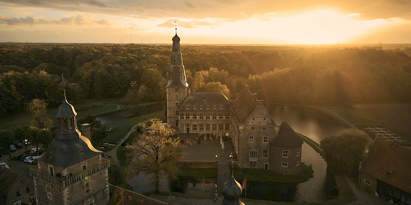 Das Schloss Raesfeld ist besonders gelungen in das Ortsbild integriert. Auf der Vorderseite schmiegen sich kleine Gebäude an die Außenmauern des Schlosses, während auf der Rückseite der historische Tiergarten auf seine Besucherinnen und Besucher wartet. Mit einer Höhe von 52,5 Metern besitzt das Schloss Raesfeld übrigens den höchsten Turm aller westfälischen Schlösser. Direkt am Schloss befindet sich auch die Tourist-Information von Raesfeld mit vielen interessanten Informationen zu Schloss und Tiergarten.