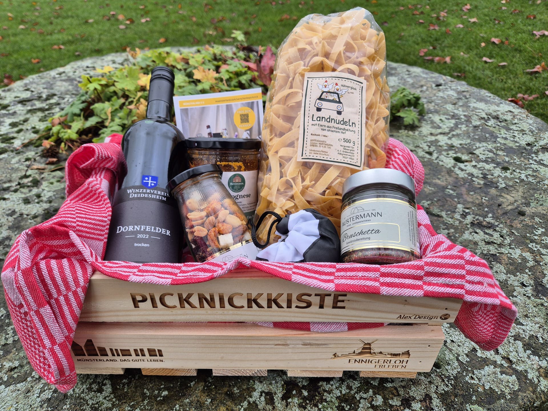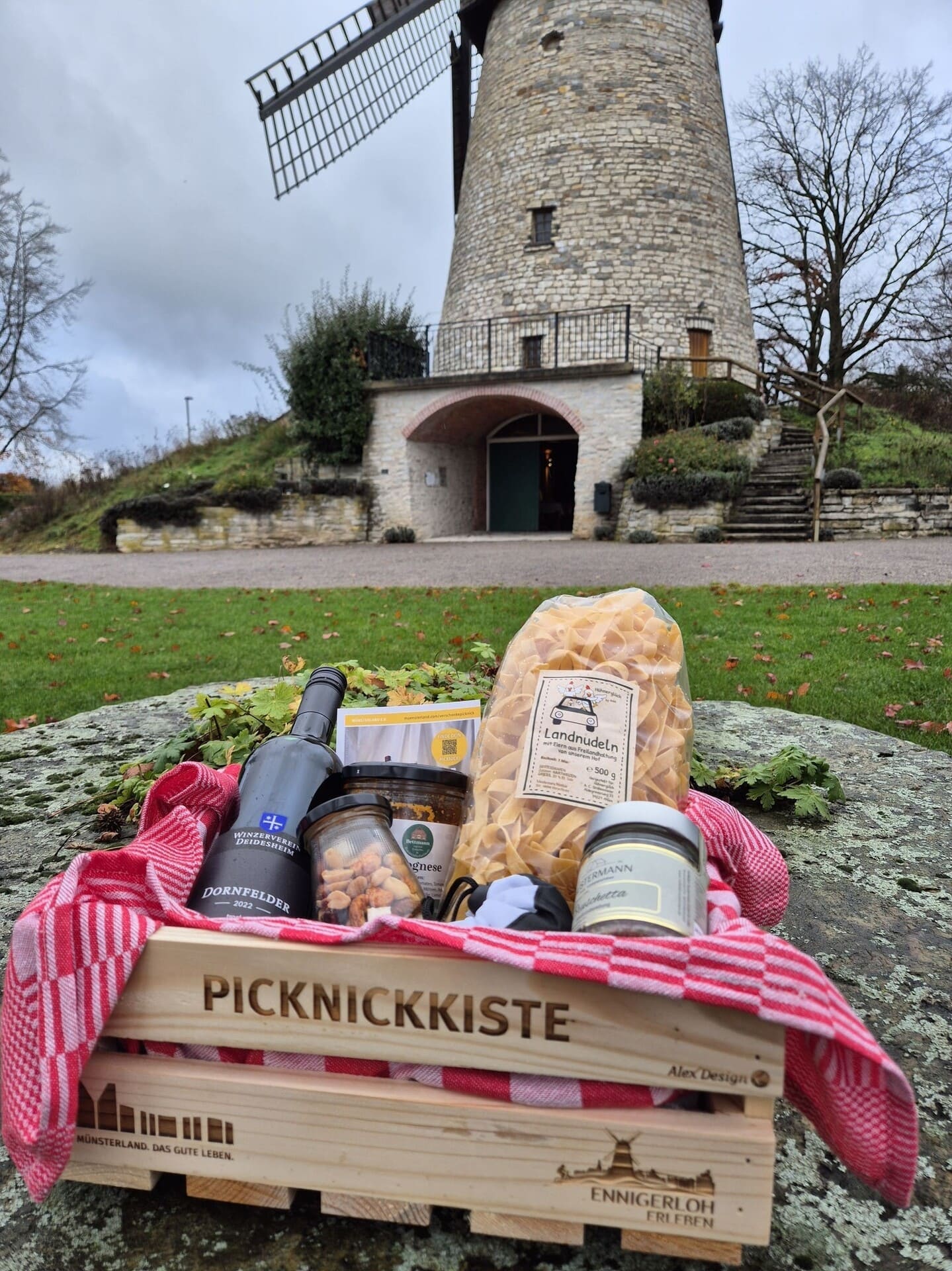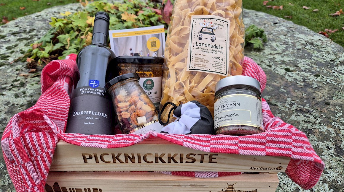Verschenke Picknick-Freude aus Ennigerloh und unterstütze den lokalen Handel! Auch die Stadt Ennigerloh nimmt an der Aktion "Verschenke ein Picknick" im Münsterland teil und bietet in der Adventszeit eine gefüllte Picknickkiste zum Kauf an. Entdecke darin viele Köstlichkeiten von regionalen Betrieben und andere tolle, heimatverbundene Artikel, welche die Beschenkte oder den Beschenkten erfreuen werden.