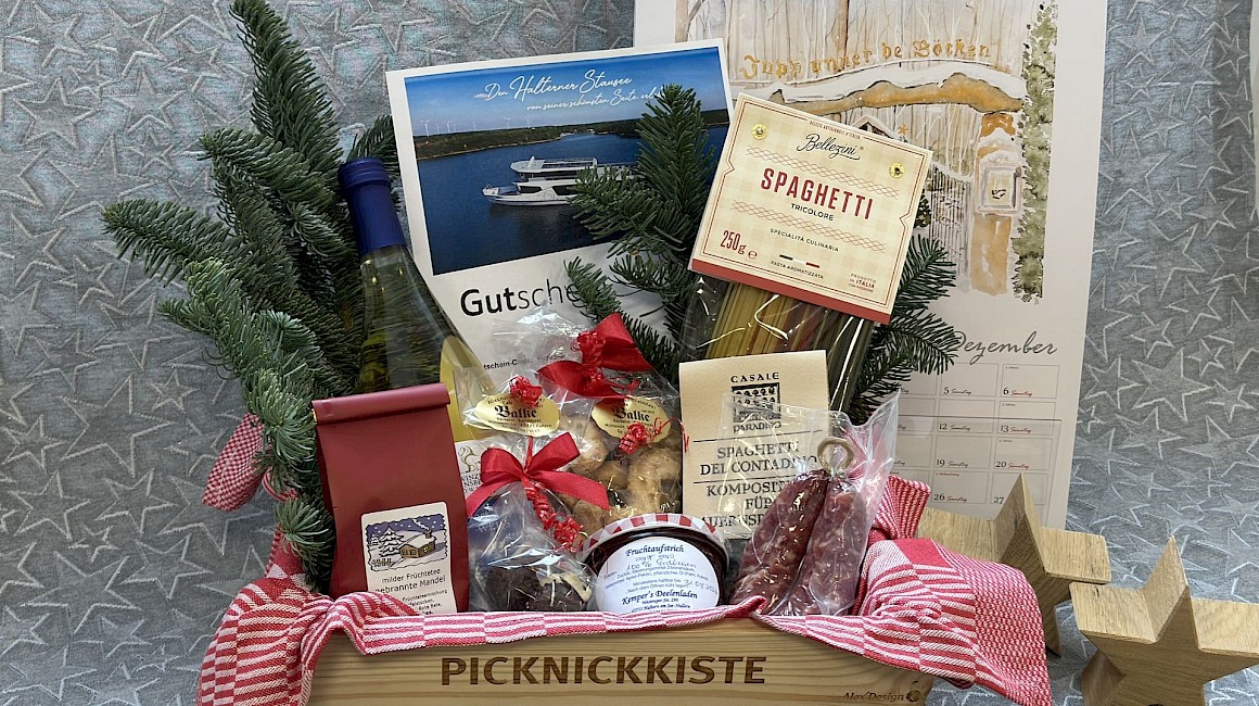 Verschenke Picknick-Freude aus Haltern am See und unterstütze den lokalen Handel! Auch die Stadtagentur | Tourist-Information in Haltern am See nimmt an der Aktion "Verschenke ein Picknick" im Münsterland teil und bietet in der Adventszeit eine gefüllte Picknickkiste zum Kauf an. Regionale Produkte und weihnachtliche Deko machen diese Kiste zu einem tollen Geschenk!