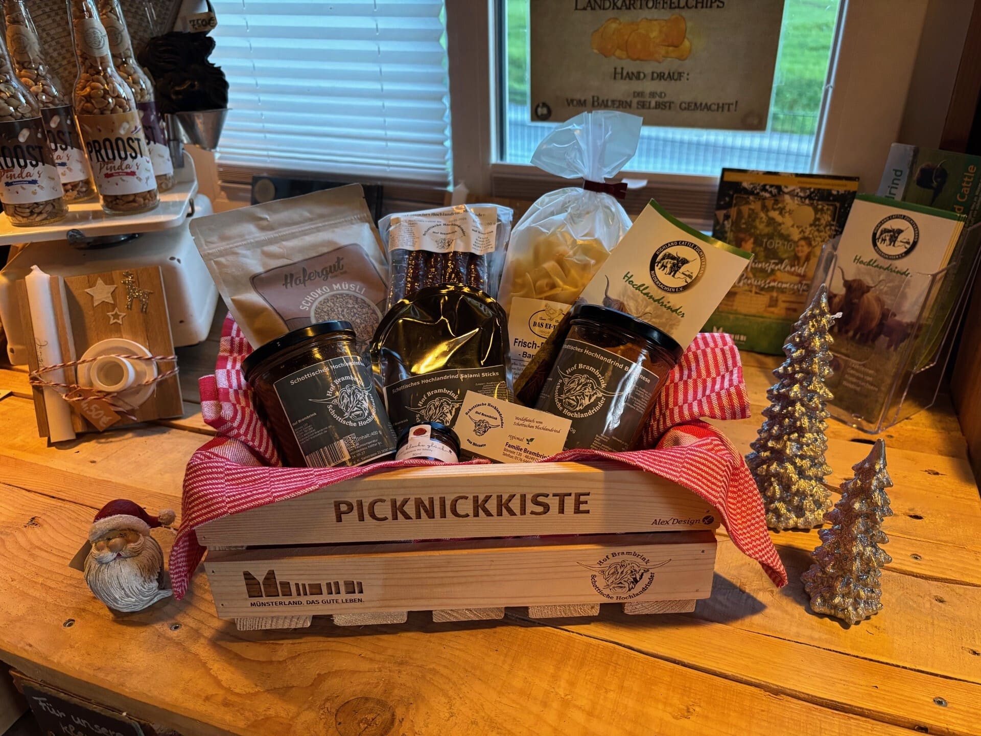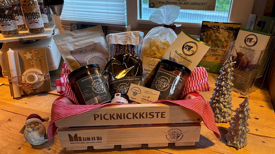 Verschenke Picknick-Freude vom Hof Bambrink aus Dülmen! Der Hof nimmt an der Aktion "Verschenke ein Picknick" im Münsterland teil und bietet in der Adventszeit eine gefüllte Picknickkiste zum Kauf an. Diese ist reich gefüllt mit regionalen Köstlichkeiten und anderen schönen Artikeln aus dem eigenen Hofladen.