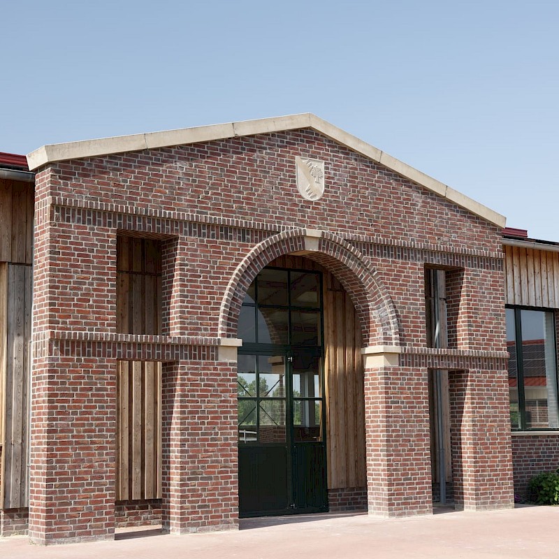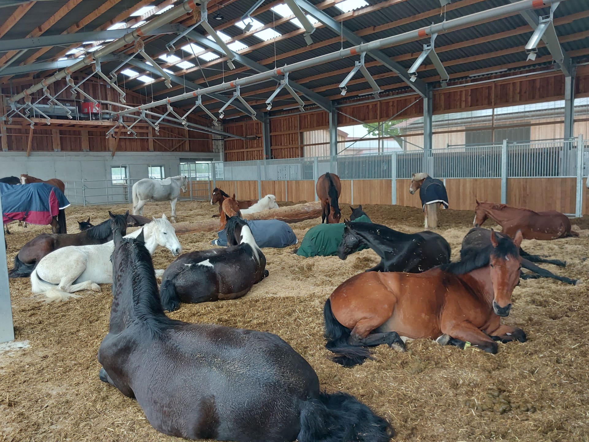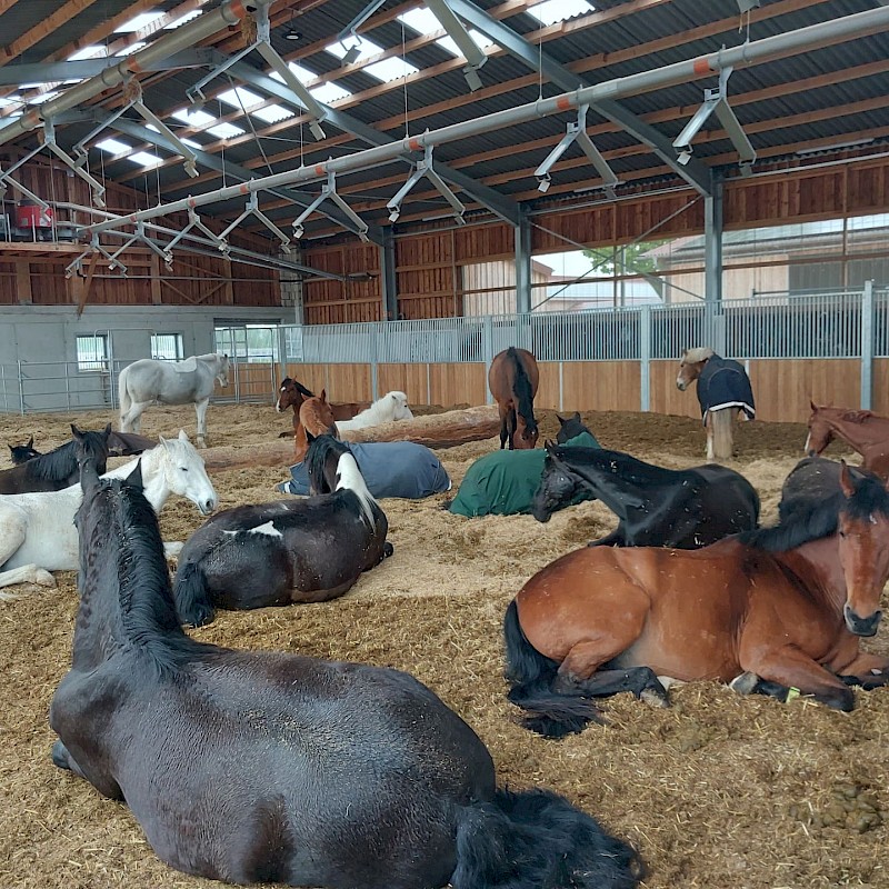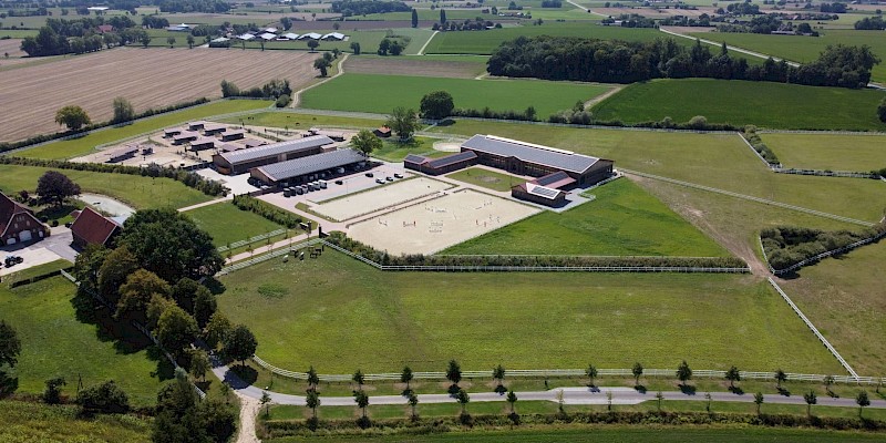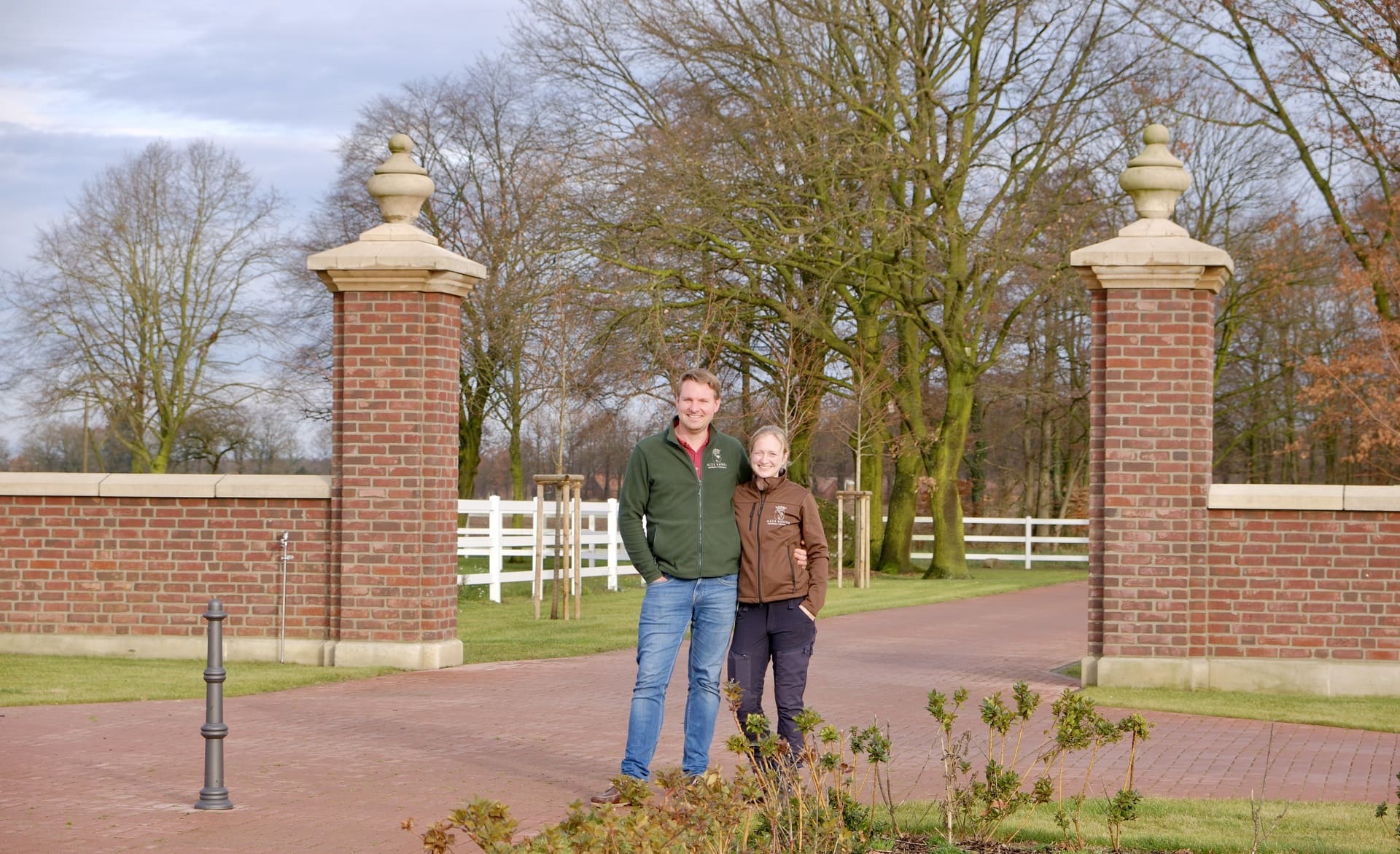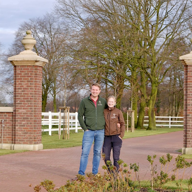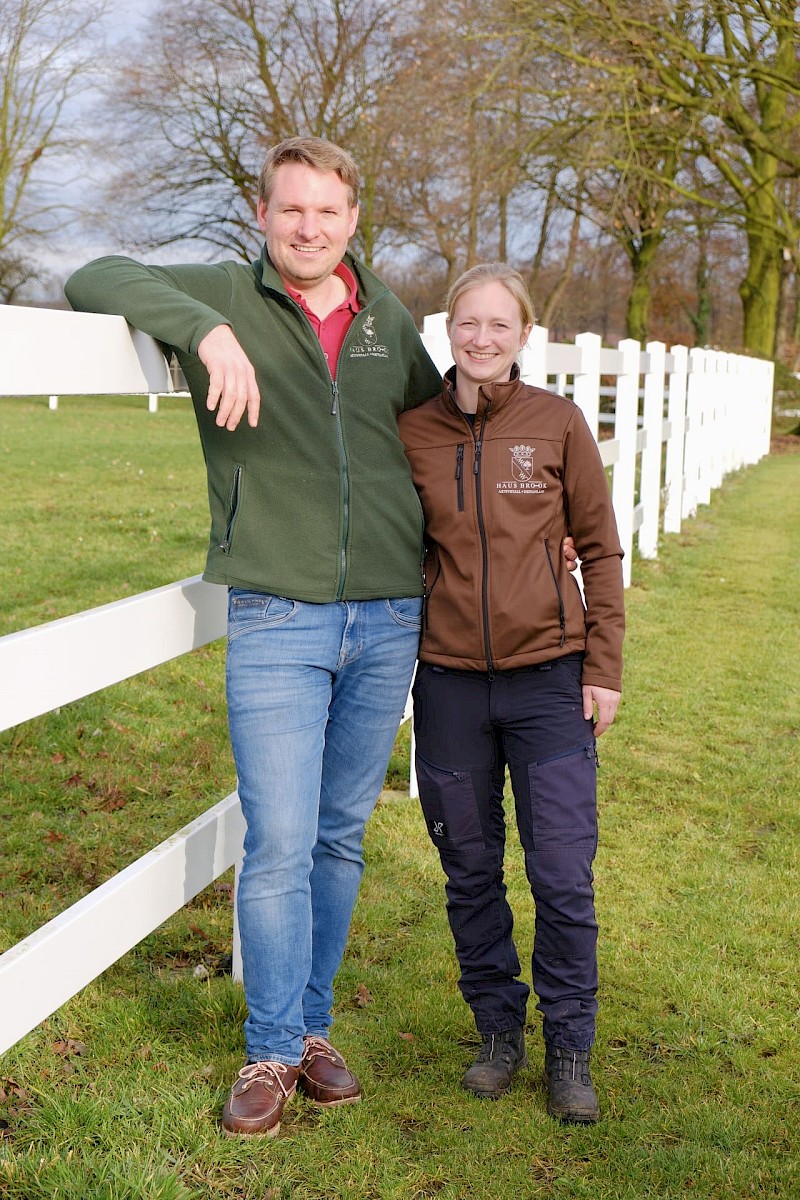 Vom hinteren Paddock tauchen Pferde auf. Im Gänsemarsch schlendern sie zwischen den Raumteilern aus Hecken und Zäunen hindurch. Sie steuern auf die Heuraufe zu, die sich gleich automatisch für die nächste Fresszeit öffnen wird. Auf Haus Brook in Senden leben 35 Stuten und 35 Wallache in jeweils einem Bewegungsstall. Die etwa 7000 Quadratmeter große Lauffläche gliedert sich in Wege, Ruhezonen, Sandbereiche, Futterautomaten, je eine große Liegehalle plus Zugänge zu den Weiden – so müssen sich die Pferde immer wieder in Bewegung setzen. Das kommt der Natur der Pferde sehr nahe. In Deutschland hat sich diese Haltungsform seit etwa 2001 weiterentwickelt. Damit ein solcher Lebensraum für Pferde auch für Sportpferdereiter interessant ist, sind gute Trainingsbedingungen mit Reithalle und Außenplätzen unabdingbar. Eine solche Kombination, wie sie Julia und Christoph Deipenbrock anbieten, ist für das Münsterland bisher ziemlich einmalig.